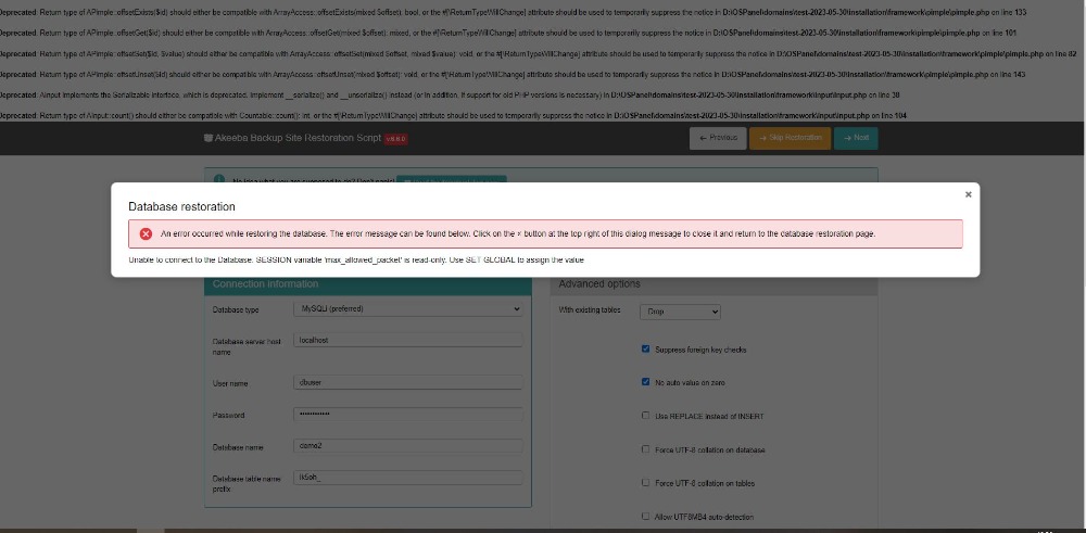 An error occurred while restoring the database. The error message can be found below. Click on the × button at the top right of this dialog message to close it and return to the database restoration page.